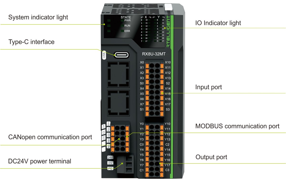 The RX series is the latest pulse PLC developed by Rtelligent. The product comes with 16 switching input points and 16 switching output points, optional transistor output type or relay output type. Host computer programming software compatible with GX Developer8.86/GX Works2, instruction specifications compatible with Mitsubishi FX3U series, faster running. Users can connect programming through the Type-C interface that comes with the product.